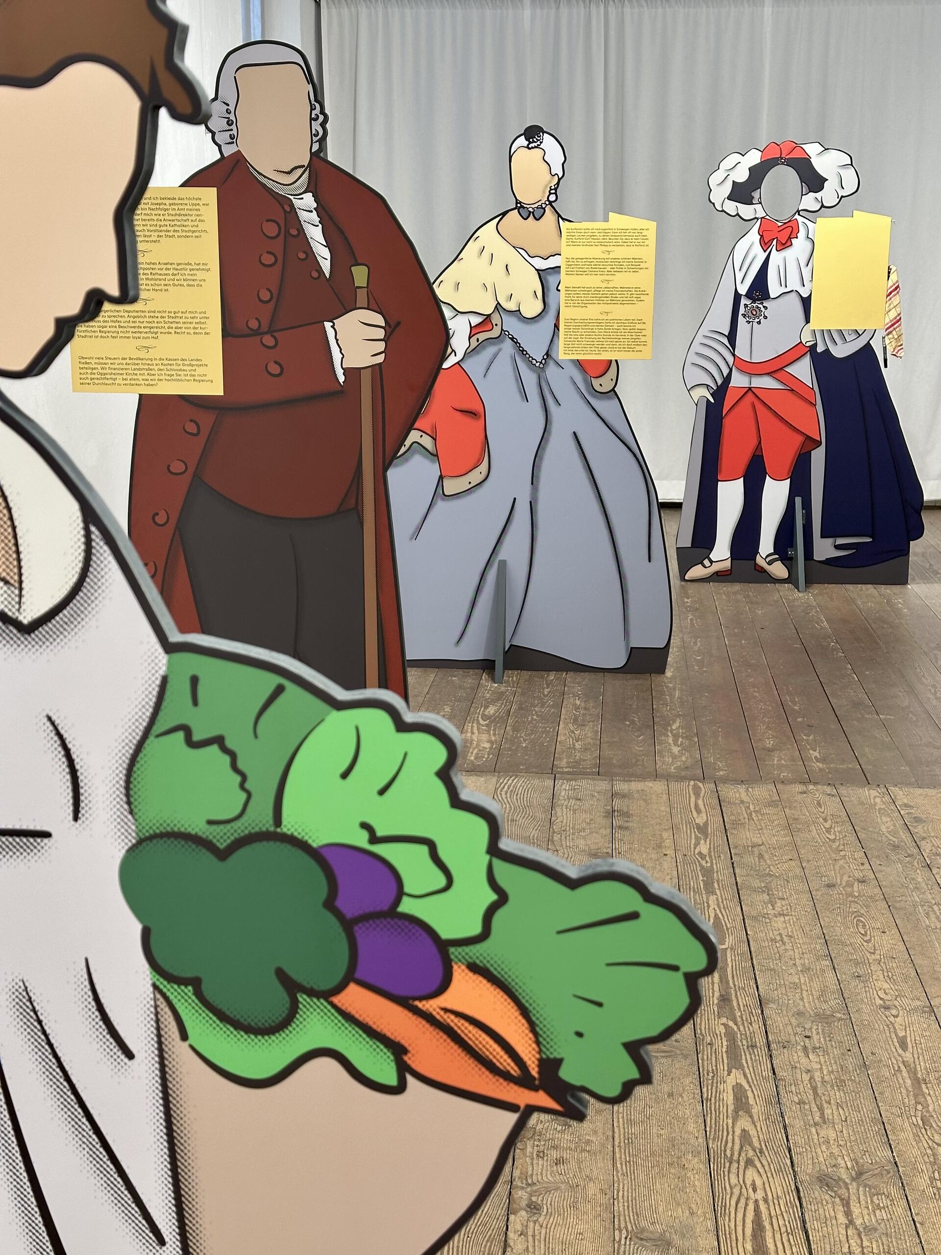 Mit rund zwanzig Figuren sind im Fürstengang ab Sonntag, 5. Oktober, Personen aus der Mannheimer Stadtgesellschaft des 18. Jahrhunderts in Neuburg zu Besuch. Das Fürstenpaar Carl Theodor und seine erste Gattin Maria Auguste geben sich persönlich die Ehre, ebenso der im Donaumoos nicht unbekannte Stephan Freiherr von Stengel, oder der Mannheimer Musiker Christian Cannabich. Auch gemeines Volk und Militär sowie Malerinnen und Mätressen stellen sich den Besuchern vor.
