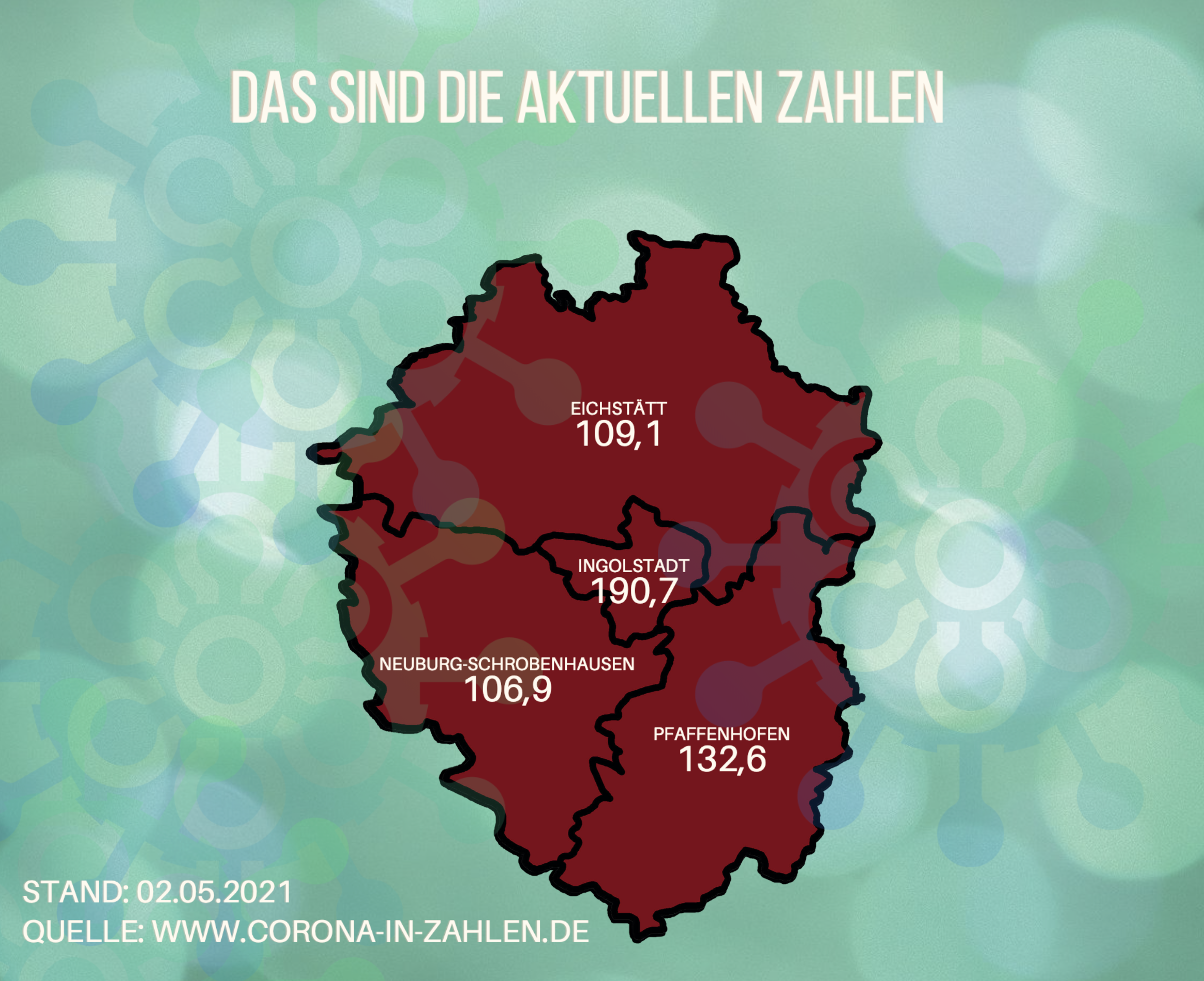 Änderungen an News einreichen TitelIntroHauptteil<p>Leicht rückläufig aber noch nicht im grünen Bereich - so könnte man die Corona-Inzidenzen in der Region <a data-tabindex-counter="1" data-tabindex-value="none" href="http://www.regioningolstadt.com" tabindex="-1">Ingolstadt</a> bezeichnen.</p> <p>Spitzenreiter in der Region ist der Landkreis <a data-tabindex-counter="1" data-tabindex-value="none" href="http://www.neuburg.com" tabindex="-1">Neuburg</a>-Schrobenhausen mit einer 7-Tages-Inzidenz von 106,9. Dicht dahinter folgt der Lankreis Eichstätt mit einer nahezu identischen Inzidenz von 109,1 Corona Neuinfektionen pro 100.000 Einwohner innerhalb der letzten 7 Tage. </p> <p>Der Landkreis Pfaffenhofen kommt mit Stand 02.05.2021 auf eine Inzidenz von 132,6 und liegt damit immer noch deutlich vor dem Schlusslicht Ingolstadt, wo derzeit 190,7 Corona Neuinfektionen innerhalb einer Wochenfrist gemeldet werden. </p> Bilder Sie können hier Dateien ablegen Erlaubte Dateitypen: NameVorschauBeschreibungAlternativtextUrheberrechtLizenzDateigrößeTypZuletzt geändertKategoriecorona-inzidenz-region-ingolstadt-anfang-mai----4.60 MBBild02.05.2021, 10:22 - Weiteres Element hinzufügen Hochladen Ihre AngabenVornameNachnameE-MailKommentarCaptchaForenameHiermit akzeptiere ich die Datenschutzerklärung Eingaben absenden Abbrechen * Pflichtfeld Möchten Sie die Änderungen verwerfen?