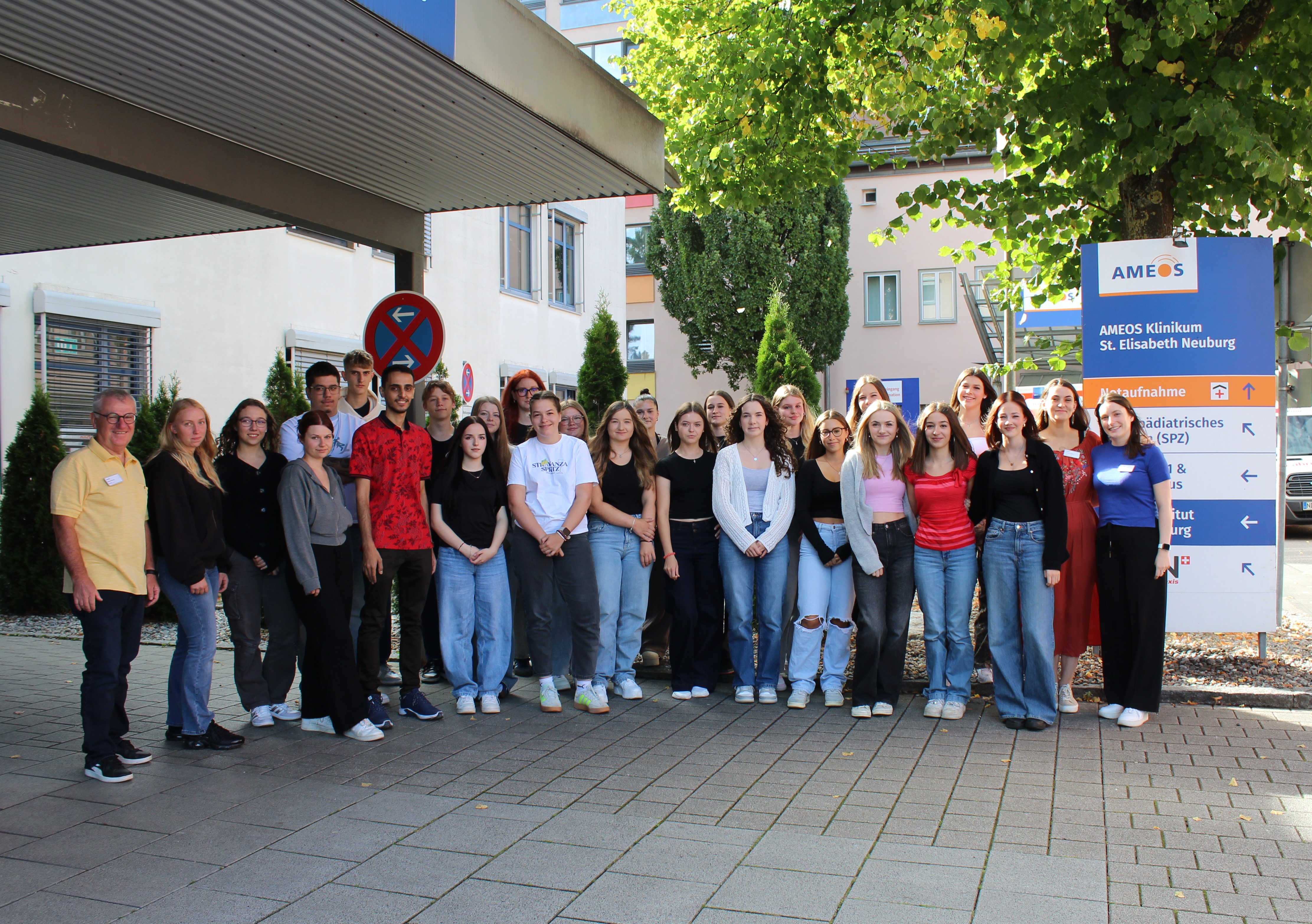 Zum 1. September 2025 hat die neue Klasse mit 27 motivierten jungen Menschen in die generalistische Ausbildung zur Pflegefachfrau und zum Pflegefachmann am AMEOS Institut Süd – Neuburg gestartet. Zudem beginnen zwei junge Menschen ihre Ausbildung zur und zum Medizinischen Fachangestellten am AMEOS Klinikum St. Elisabeth Neuburg. Damit sind die beiden die ersten, welche die seit diesem Jahr neu angebotene Ausbildung zur MFA am Neuburger Krankenhaus beginnen. Die Azubis werden in den nächsten drei Jahren verschiedene Abteilungen durchlaufen und umfassende Einblicke in moderne diagnostische Untersuchungen und Behandlungen in der stationären Versorgung erhalten. Die Krankenhausleitung des AMEOS Klinikum St. Elisabeth Neuburg sowie die Leitung des AMEOS Institut Süd – Neuburg heißt die Auszubildenden recht herzlich in Neuburg willkommen und wünschte einen guten Start in drei spannende und lehrreiche Jahre, die von interdisziplinären Lernen geprägt sein werden. „Wir freuen uns sehr, dass sich so viele junge Menschen für eine Ausbildung im Gesundheitswesen begeistern und wünschen ihnen viel Erfolg und Durchhaltevermögen für die nächsten drei Jahre“, so Florian Kern, Krankenhausdirektor im AMEOS Klinikum St. Elisabeth Neuburg. Neben der Ausbildung zur MFA und der generalistischen Ausbildung zur Pflegefachfrau bzw. zum Pflegefachmann, besteht auch die Möglichkeit, eine Ausbildung zur Operationstechnischen oder Anästhesietechnischen Assistenz oder zur Pflegefachhelferin bzw. zum Pflegefachhelfer zu absolvieren. Informationen rund um die Ausbildung finden Interessierte auf der Website unter karriere.ameos.eu/azubis-sued. AMEOS sichert die Gesundheitsversorgung in den Regionen: An über 50 Standorten in unseren Krankenhäusern, Poliklinika, Reha-, Pflege- und Eingliederungseinrichtungen sind wir Vorreiter in Medizin, Pflege und Betreuung. Rund 18.000 Mitarbeitende kümmern sich jährlich um das Wohlergehen von über einer halben Million Menschen. Denn für AMEOS gilt: vor allem Gesundheit.